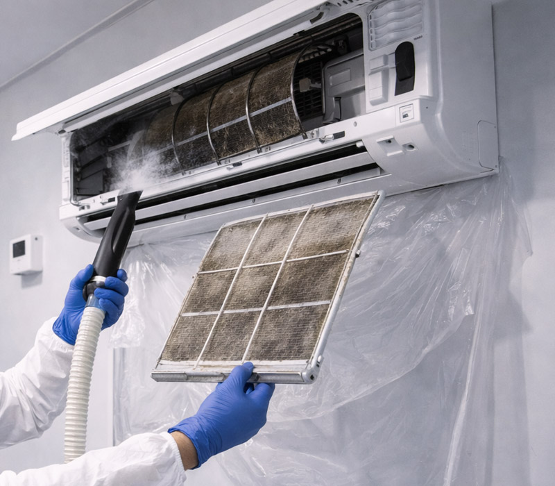 - Nettoyage complet et désinfection des réseaux aérauliques